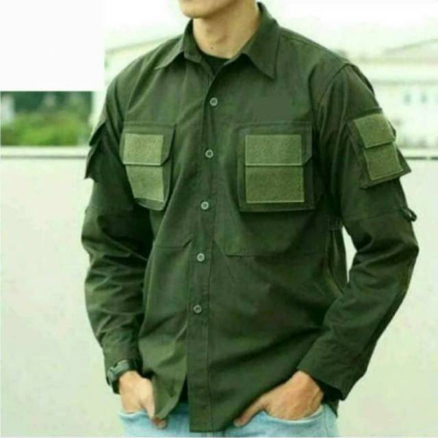 Kemeja bergaya army look ini sangat mencuri perhatian banyak orang. Baju ini memberikan kesan sporty, jadi bisa dipakai dalam berbagai kegiatan dan suasana. Selain itu, kemeja ini pun identik dengan warnaolive. Sangat wajar karena warna ini yang selalu banyak dijumpai di setiap pakaian tentara. Warna ini memungkinkan tentara dapat bersembunyi di rerumputan sebagai kamuflase supaya tidak nampak oleh musuh. Jadi jika ingin tampil trendi dengan gaya army, pilihan warna netral yang satu ini menjadi item yang wajib kamu miliki.